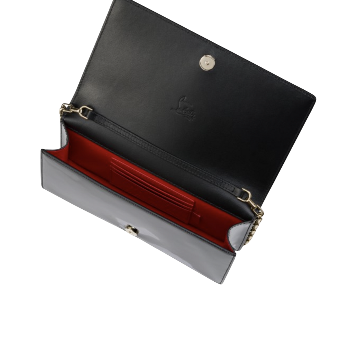 The sophisticated Bettina clutch features a gold embellishment on the front, evoking the silhouette of the iconic sole. This signature model from Maison Christian Louboutin is entirely crafted in black patent calf leather and is ideal for nights out. The calf leather has been given a high-gloss finish, making it shiny and reflective for a timeless look.