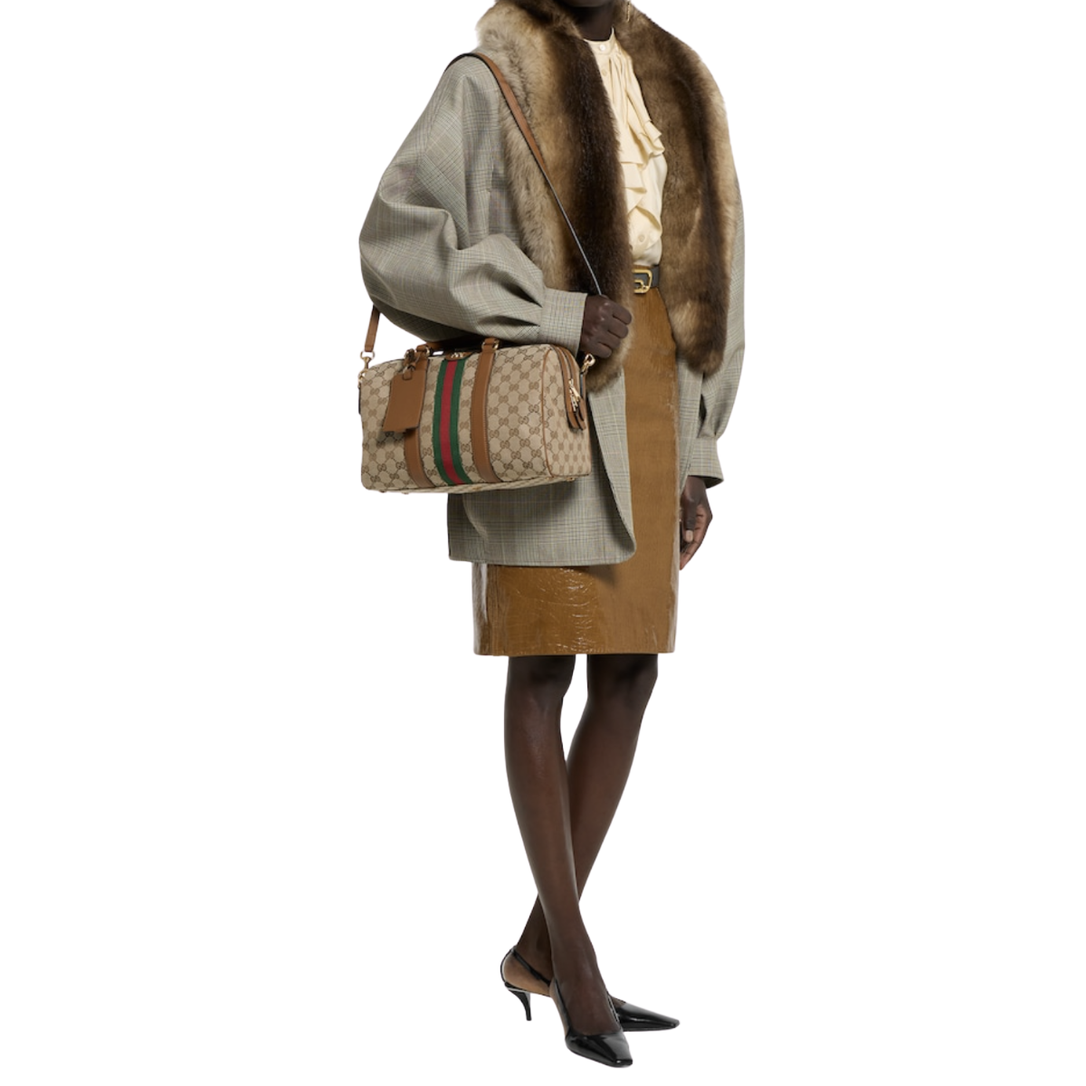 The Ophidia collection evokes the House’s heritage with the signature Web stripe and Double G emblem, featured here in gold-toned finish. This style is crafted from GG canvas in a signature color of the season.